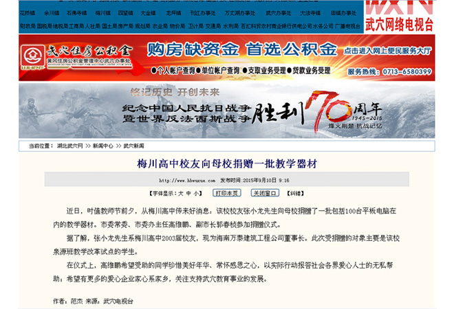 梅川高中校友張小龍向母校捐贈一批教學器材